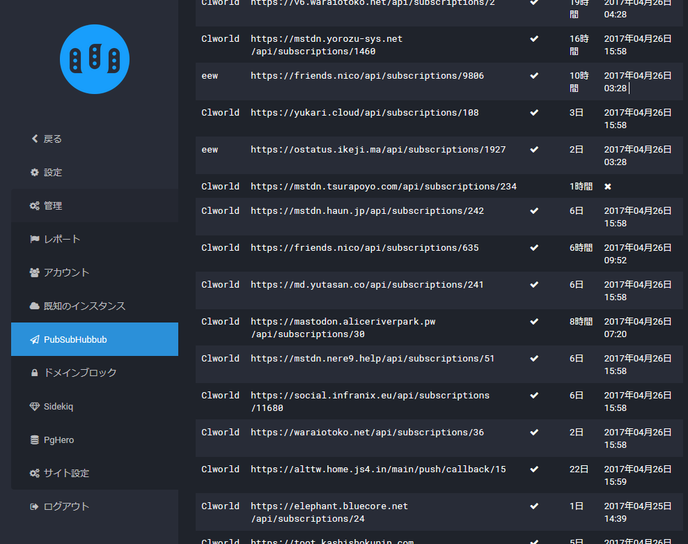 単なるcronの回し忘れとかの場合受信側のsubscribeを投げるサーバの方でもフォロワーがいるaccountsのsubscription_expires_atが過去になることでsubscriptionが切れていることが分かる。(ただし相手がGNU Socialの場合何か動作がおかしいし、事故によってSubscriptionが消えた場合はこれでは検知出来ない)